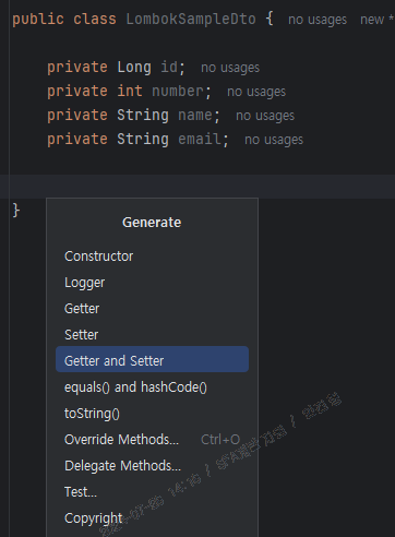 우선, Lombok 을 사용하지 않는다면 아래와 같이 IDE 의 기능을 활용해 getter() / setter() 와 같은 메서드를 포함하여, 생성자, toString() 등을 생성할 수 있다.