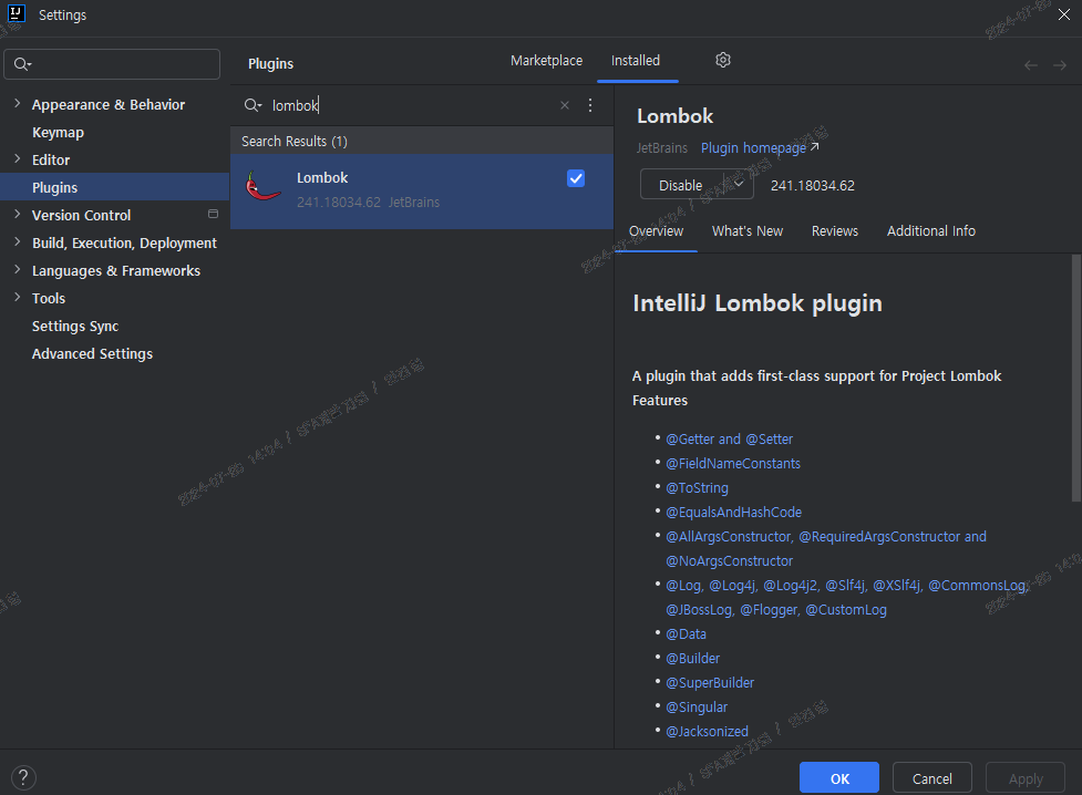 [File] > [Settings] > [Plugins] > "lombok" 검색 > install