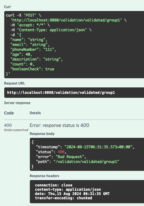 [2024-08-15 15:31:35.568] [WARN ] [http-nio-8080-exec-5] org.springframework.web.servlet.mvc.support.DefaultHandlerExceptionResolver Resolved [org.springframework.web.bind.MethodArgumentNotValidException: Validation failed for argument [0] in public org.springframework.http.ResponseEntity<cohttp://m.springboot.valid.data.dto.ValidatedRequestDto> cohttp://m.springboot.valid.controller.ValidatedController.checkValidationByValidatedAnnoGroup1(com.springboot.valid.data.dto.ValidatedRequestDto): [Field error in object 'validatedRequestDto' on field 'phoneNumber': rejected value [111]; codes [Telephone.validatedRequestDto.phoneNumber,Telephone.phoneNumber,Telephone.java.lang.String,Telephone]; arguments [org.springframework.context.support.DefaultMessageSourceResolvable: codes [validatedRequestDto.phoneNumber,phoneNumber]; arguments []; default message [phoneNumber]]; default message [전화번호 형식이 올바르지 않습니다.]] ]