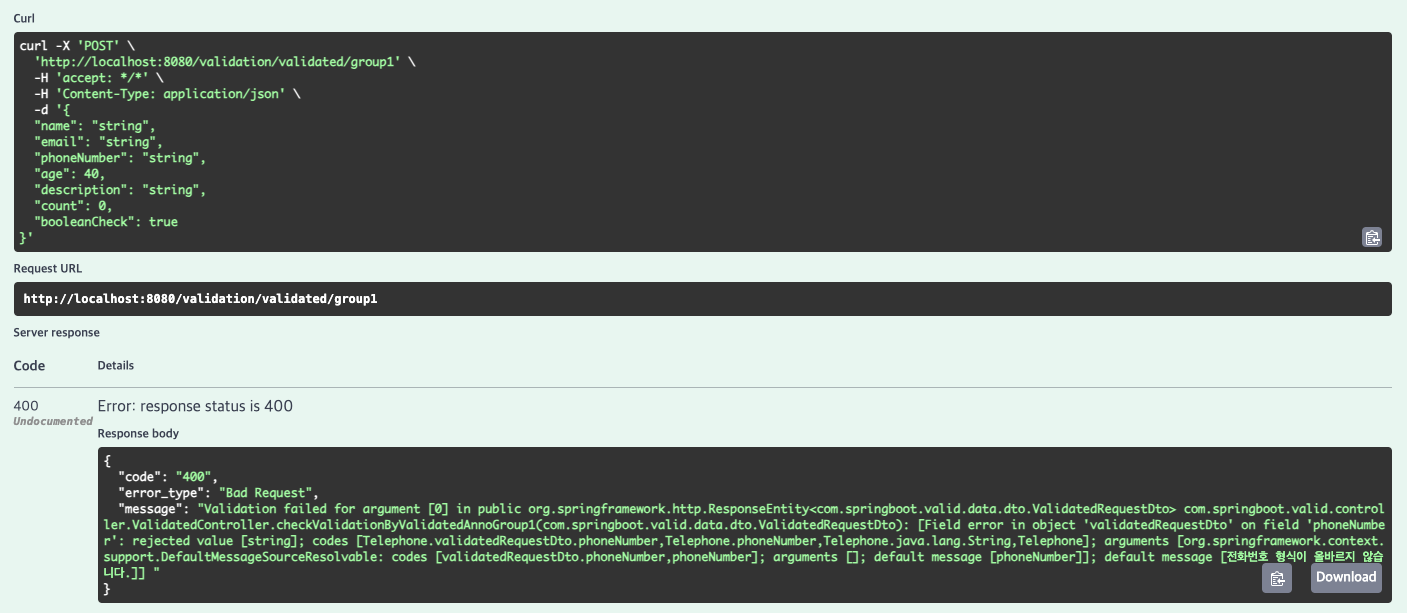 Validation failed for argument [0] in public org.springframework.http.ResponseEntity<com.springboot.valid.data.dto.ValidatedRequestDto> com.springboot.valid.controller.ValidatedController.checkValidationByValidatedAnnoGroup1(com.springboot.valid.data.dto.ValidatedRequestDto): [Field error in object 'validatedRequestDto' on field 'phoneNumber': rejected value [string]; codes [Telephone.validatedRequestDto.phoneNumber,Telephone.phoneNumber,Telephone.java.lang.String,Telephone]; arguments [org.springframework.context.support.DefaultMessageSourceResolvable: codes [validatedRequestDto.phoneNumber,phoneNumber]; arguments []; default message [phoneNumber]]; default message [전화번호 형식이 올바르지 않습니다.]]