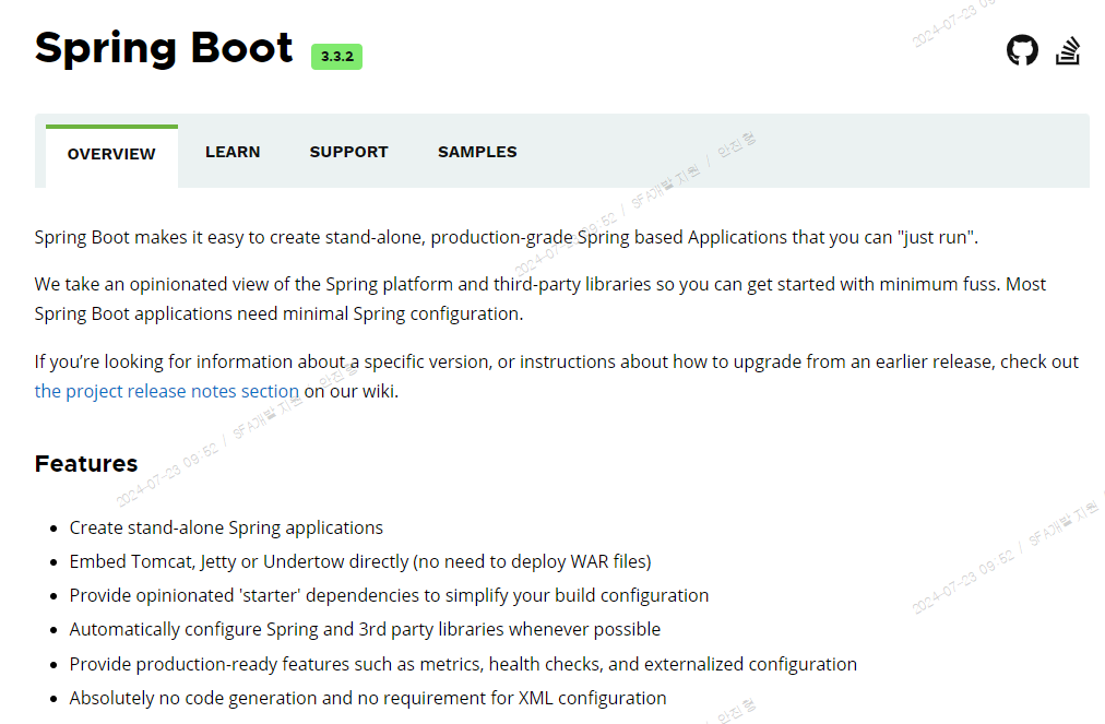1. SpringBoot2. Spring Boot 특징 3. Spring Framework 와 SpringBoot What is Spring Boot ? 스프링 공식 문서에서는 다음과 같이 설명하고 있다.Spring Boot makes it easy to create stand-alone, production-grade Spring based Applications that you can "just run".We take an opinionated view of the Spring platform and third-party libraries so you can get started with minimum fuss. Most Spring Boot applications need minimal Spring..